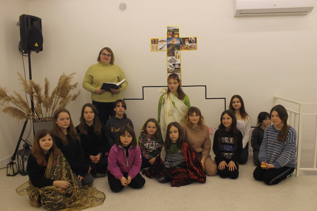«Почалася весна. В природі все зеленіє та оживає. Що це означає?», — загадково запитала Катя. Діти почали відгадувати, та все не правильно. «Це означає, що скоро свято Пасхи. Моя бабуся спече домашніх пасок, пофарбуємо яйця, все складемо в корзину та підемо святить в церкву. Бабуся каже, що ця їжа стає святою», — дає відгадку сама Катя. Ми розробили цикл занять із семи біблійних тем, які допоможуть дітям дізнатися про справжню Пасху. Дитяча увага прикута до незвичайного хреста, всередині якого багато картинок. «Щоб це означало? Це Ісус, це Його мати. До чого тут півень, всі ці люди, осел?» — розмірковують діти. На першій зустрічі дівчата почули що в Ісуса було дванадцять учнів. Вони знайшли їх на картинках та змогли уявно відтворити в сценці як Ісус ходив і запрошував кожного з них. З паперу виготовили корзину, в неї будуть складати ті речі, які дійсно потрібно мати, щоб освячуватися. Крок за кроком вихованці більше дізнаються про вчення Ісуса, Його смерть та воскресіння і цю радісну новину понесуть з корзиною у Великдень в свої родини.